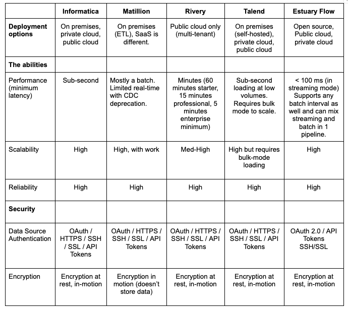 Deployment options: Of these ETL vendors, Estuary is currently the only vendor to offer open source, private cloud, and public multi-tenant SaaS.