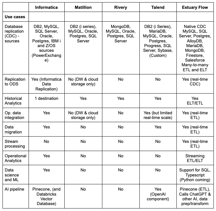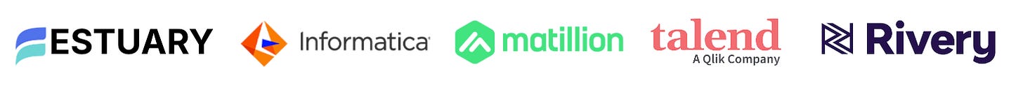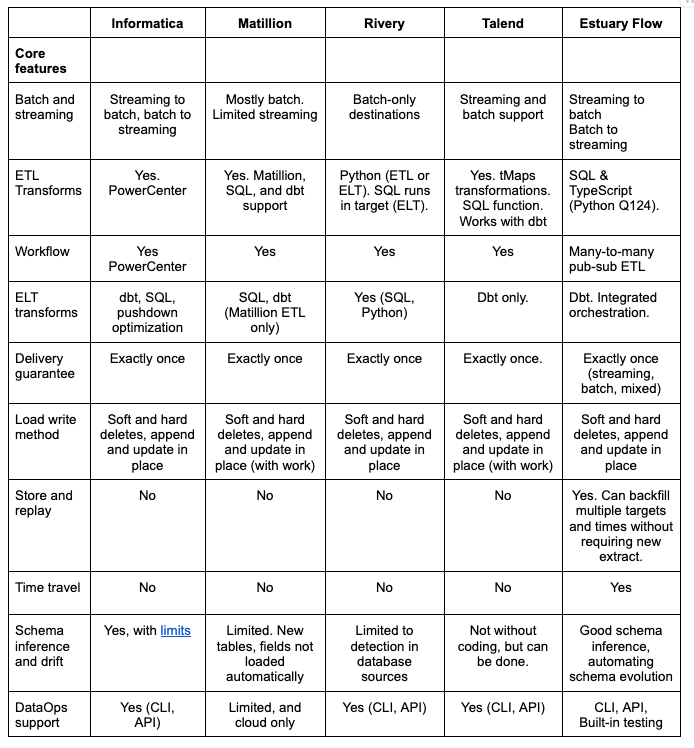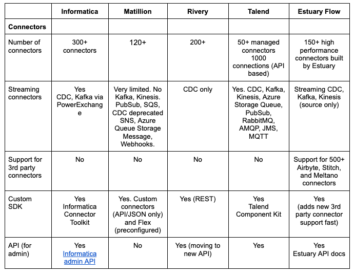 Streaming support: Estuary has a modern approach to CDC that is built for reliability and scale, and great Kafka support as well. It is arguably the best of all the options here. Matillion has deprecated their CDC support, and Rivery only has CDC support. It does not support messaging. Informatica and Talend also have good CDC and messaging support.