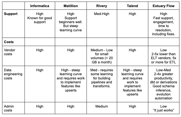 Of the various ELT vendors, Estuary is the lowest total cost option. Rivery is the next lowest-cost option, approaching 10x or higher costs at larger scales for pay-as-you-go pricing before negotiations for enterprise pricing. Both lower than other ETL vendors.